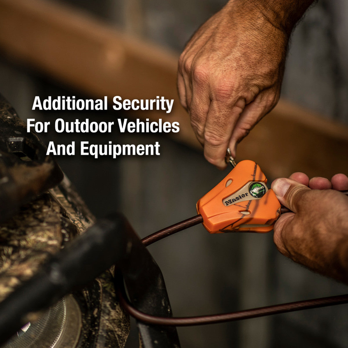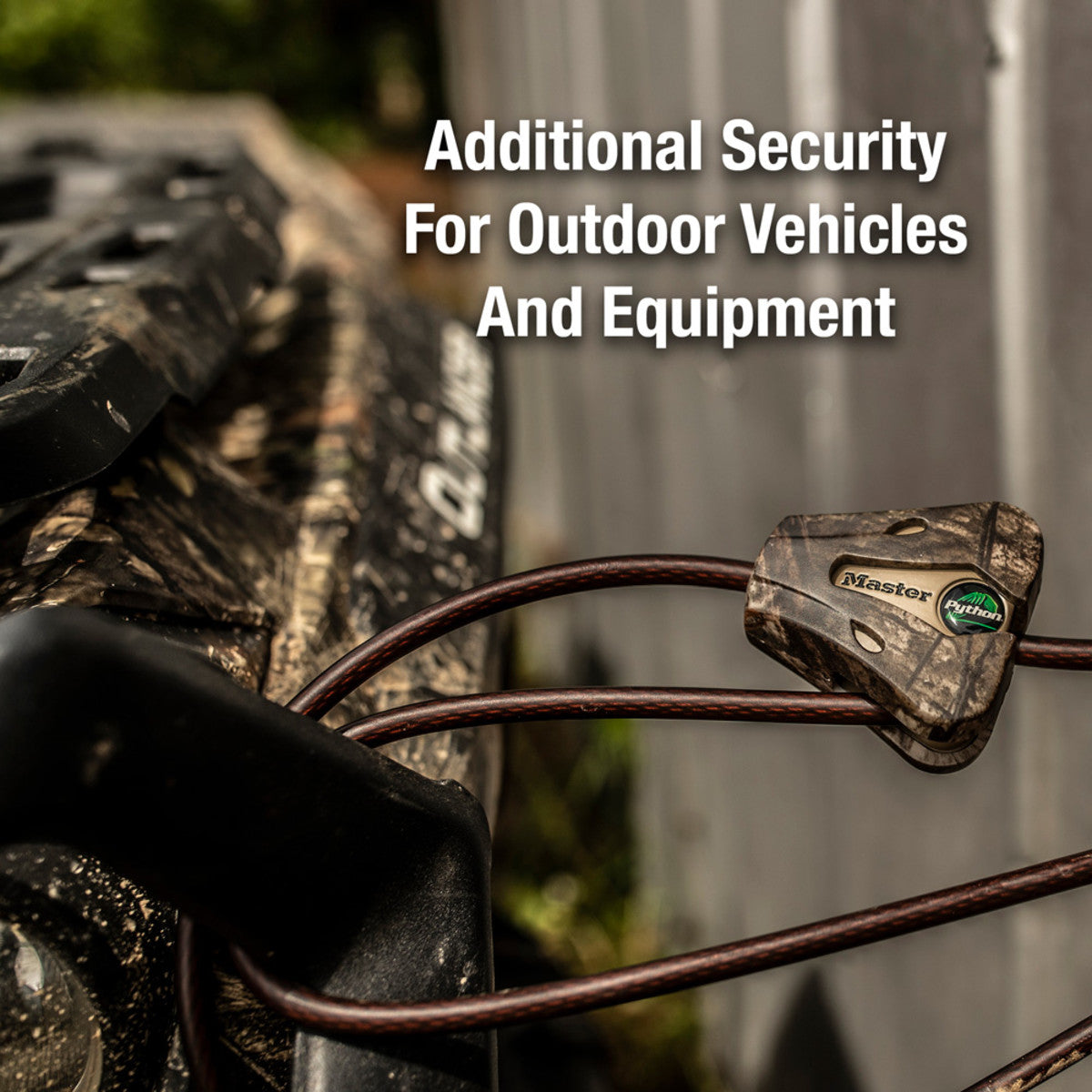 The Master Lock Python™ Adjustable Locking Cable is 6ft (1.8m) long and 5/16in (8mm) diameter, featuring braided steel for maximum strength and flexibility. The patented locking mechanism holds the cable tight at any position for the perfect fit. The Mossy Oak® Country DNA™ pattern provides outdoor camouflage security. Both cables are keyed alike for the ultimate convenience. The integrated pin tumbler keyed locking mechanism provides superior pick resistance. The rust resistant lock and vinyl coated cable provide superior weather and scratch resistance. The Limited Lifetime Warranty provides peace of mind from a brand you can trust.