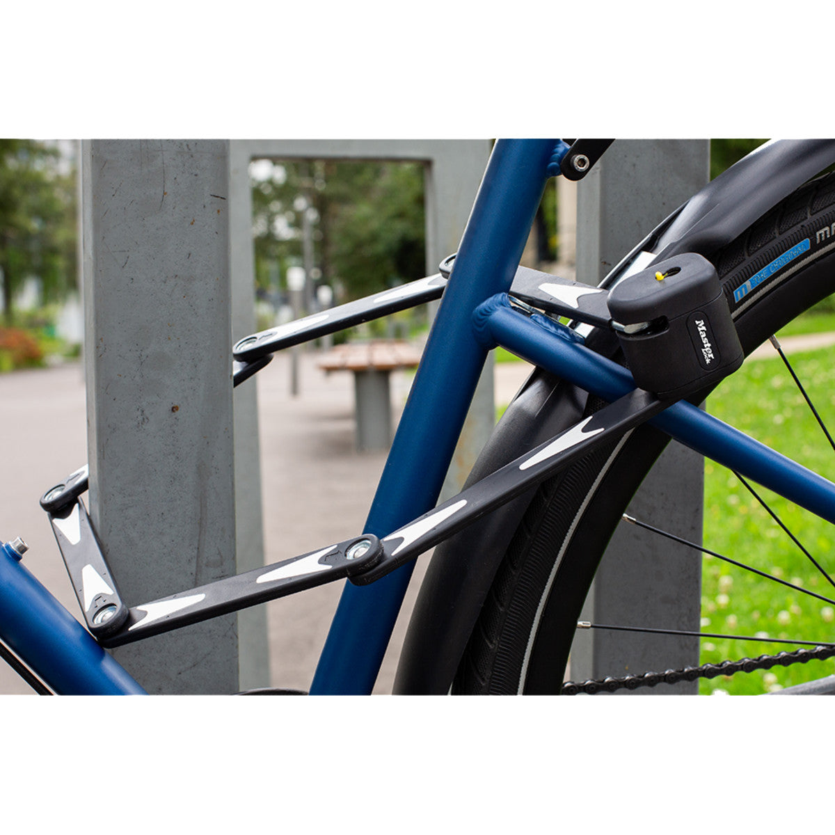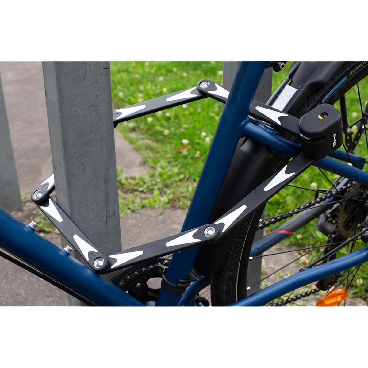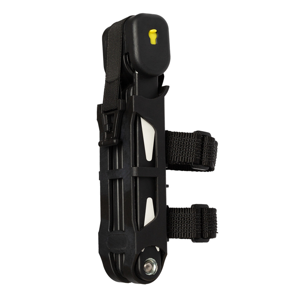 The Master Lock U-Lock folds out to 3 ft and features 5 mm hardened steel links that stand up to cutting and sawing. Each link is reinforced with stainless steel rivets for serious pry resistance. A vinyl cover helps protect your bike from scratches and the elements. The included carrier bracket makes it easy to store and carry.