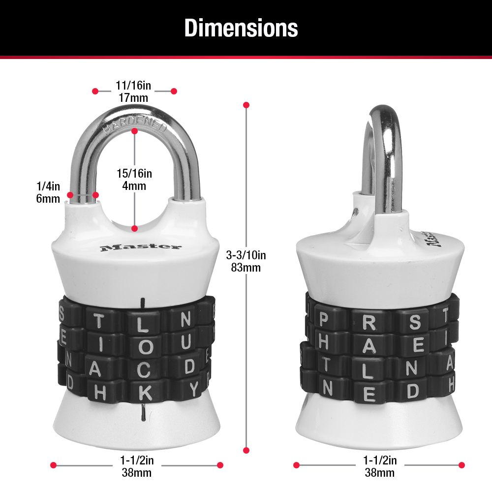 This word combination lock offers customizable, keyless access with a slim, ergonomic design. The durable padlock features a hardened steel shackle and a metal body for daily use. The colorful combo lock finish adds visibility and personalization.