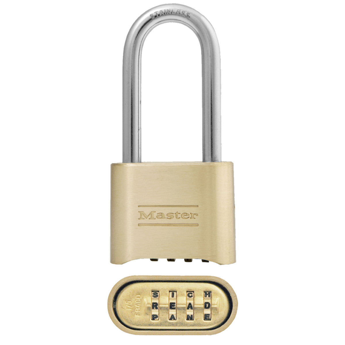 The Master Lock No. 175DWD Set Your Own WORD Combination Padlock features a 2in (51mm) wide solid body for strength and reliability. The 5/16in (8mm) diameter shackle is 1in (25mm) long and made of hardened steel, offering extra resistance to cutting and sawing. The 4-digit dialing allows for thousands of possible word combinations. The Limited Lifetime Warranty provides peace of mind from a brand you can trust.