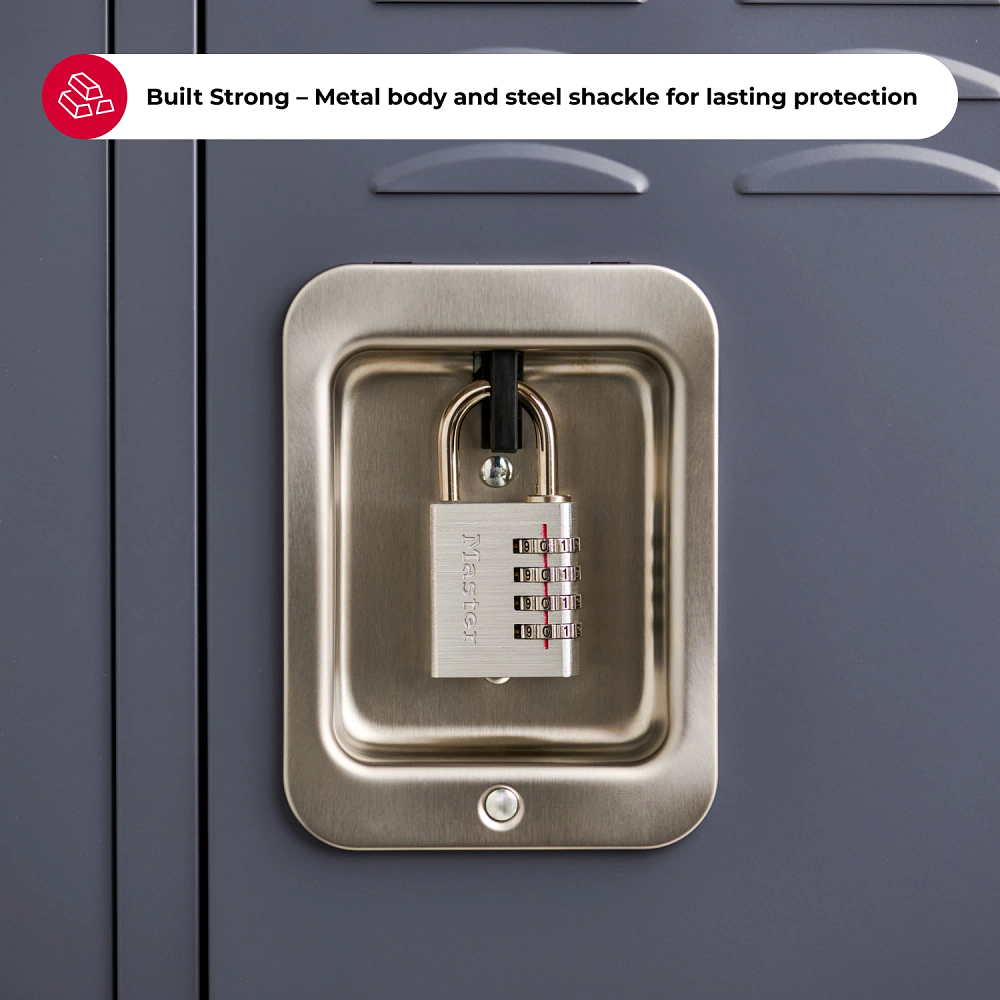This solid metal combination lock provides dependable, keyless security with a set–your–own four digit code. The 1–9/16 in wide body withstands daily use, while the nickel–plated steel shackle offers cut resistance. This padlock is designed for long–lasting reliability in lockers, gates, and storage units. The easy–to–use combo lock mechanism ensures quick access without the need for keys.